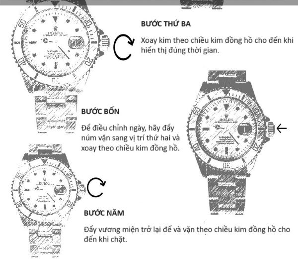 Lưu ý quan trọng: Khi thao tác với núm chỉnh, hãy luôn thực hiện một cách nhẹ nhàng và cẩn thận. Việc cố gắng vặn hoặc kéo quá mạnh có thể làm hỏng các bộ phận bên trong của đồng hồ Rolex.