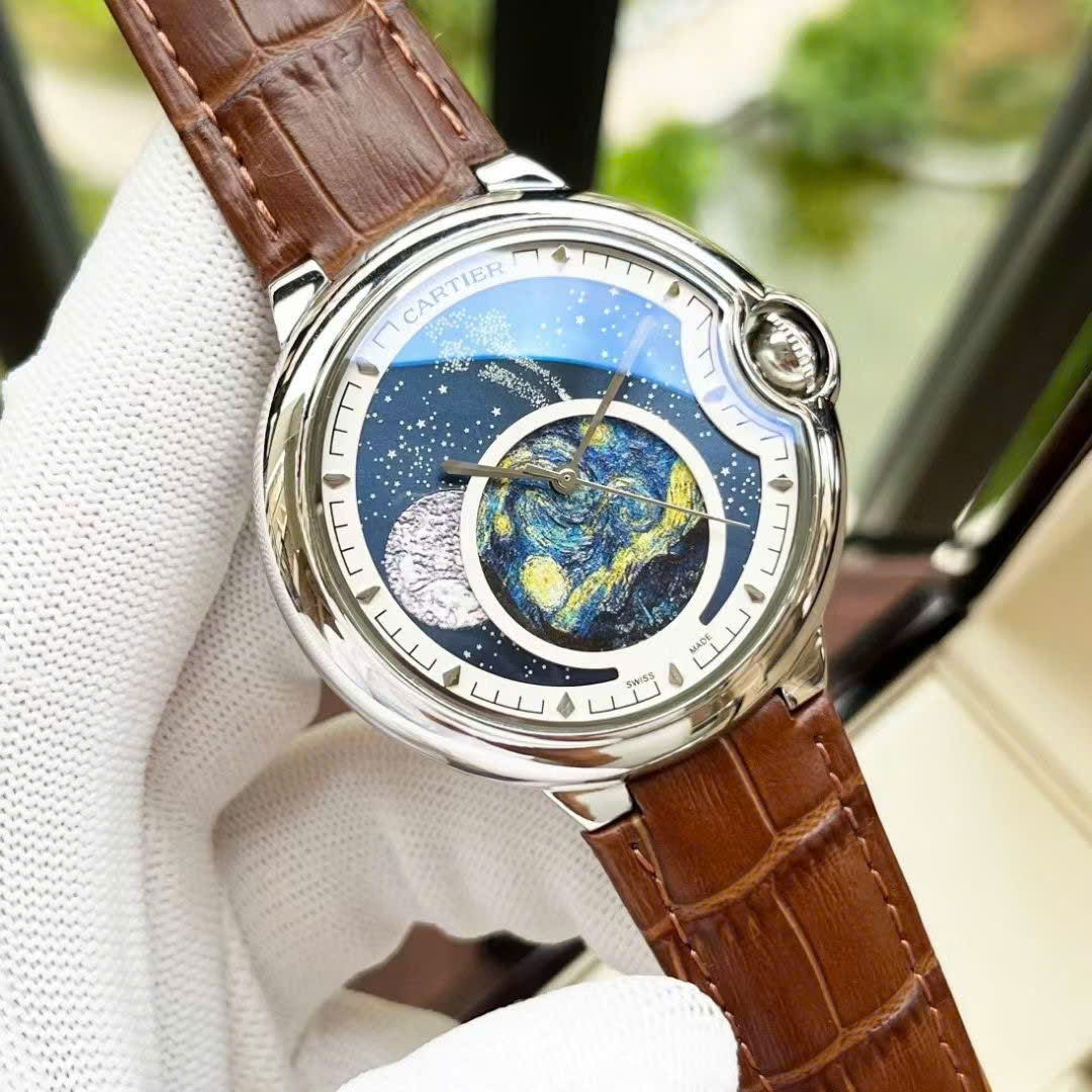 Đồng Hồ Cartier Nam Dây Da Máy Cơ Nhật Mặt Số Trái Đất Automatic 42mm