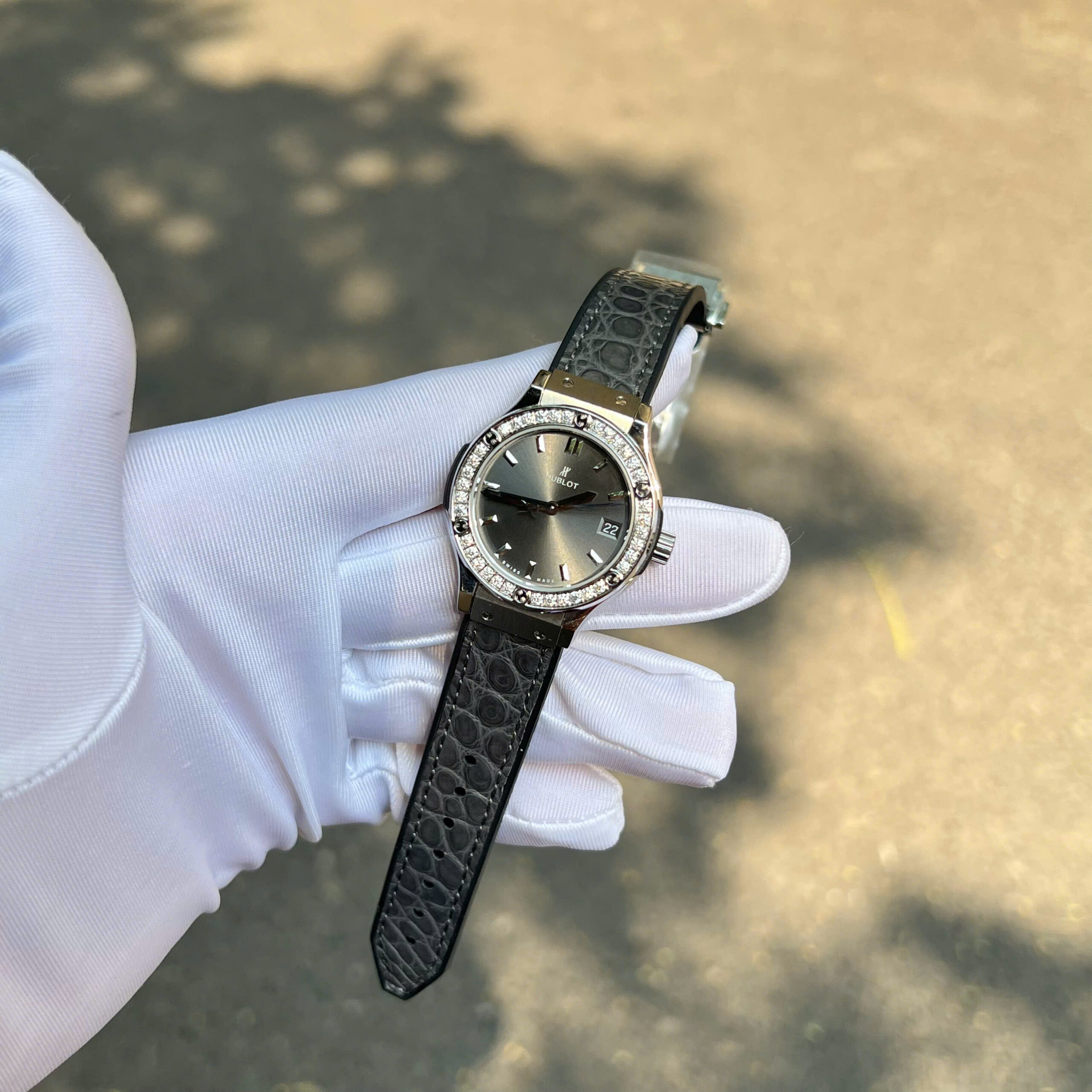 Đồng Hồ Nữ Hublot Classic Fusion Titanium Đính Kim Cương Moissanite Chế Tác Mặt Xám 33mm