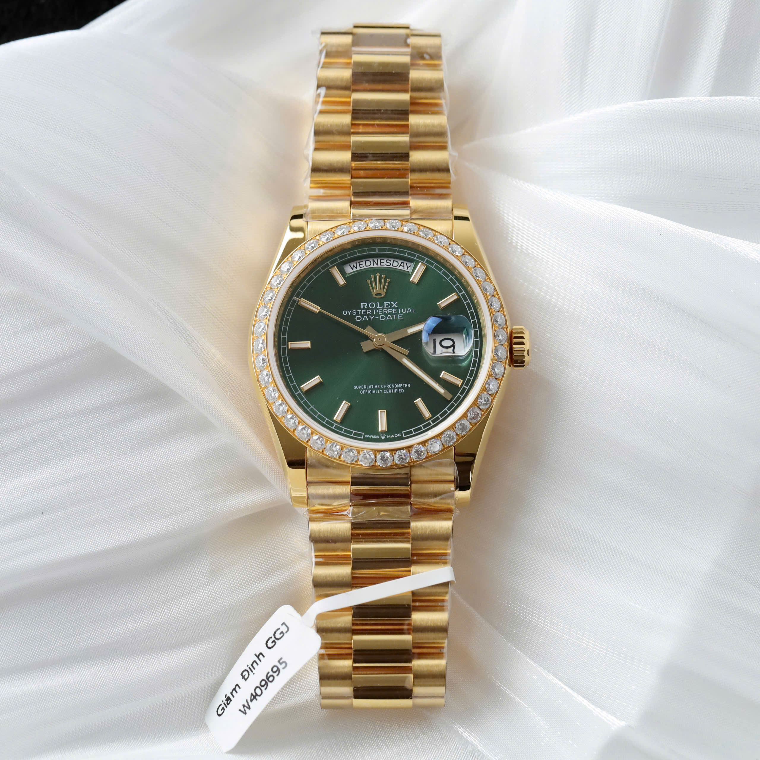 Đồng Hồ Rolex Day-Date 118338 Bọc Vàng Thật Đính Moissanite Mặt Xanh Lá Cây 36mm