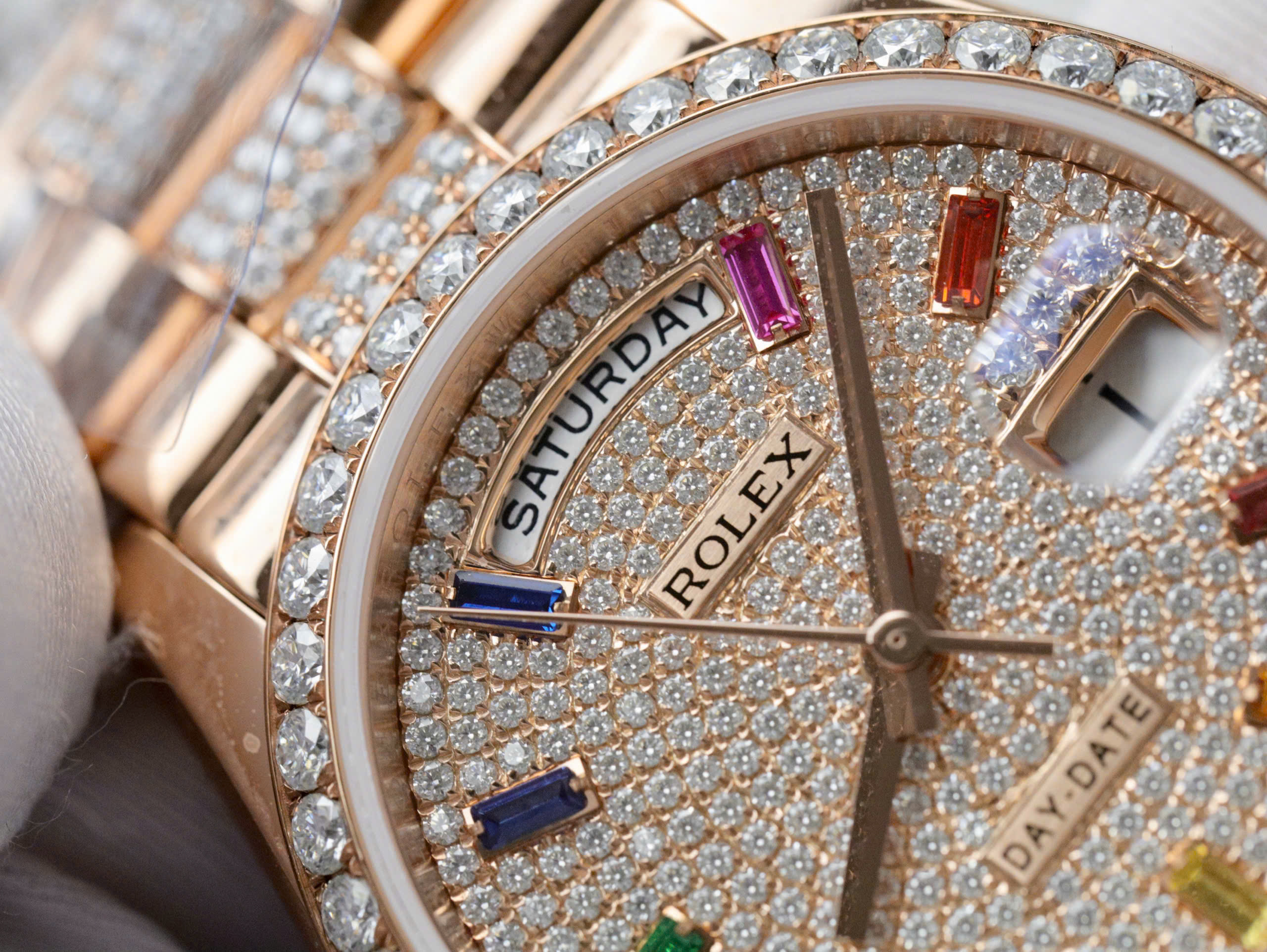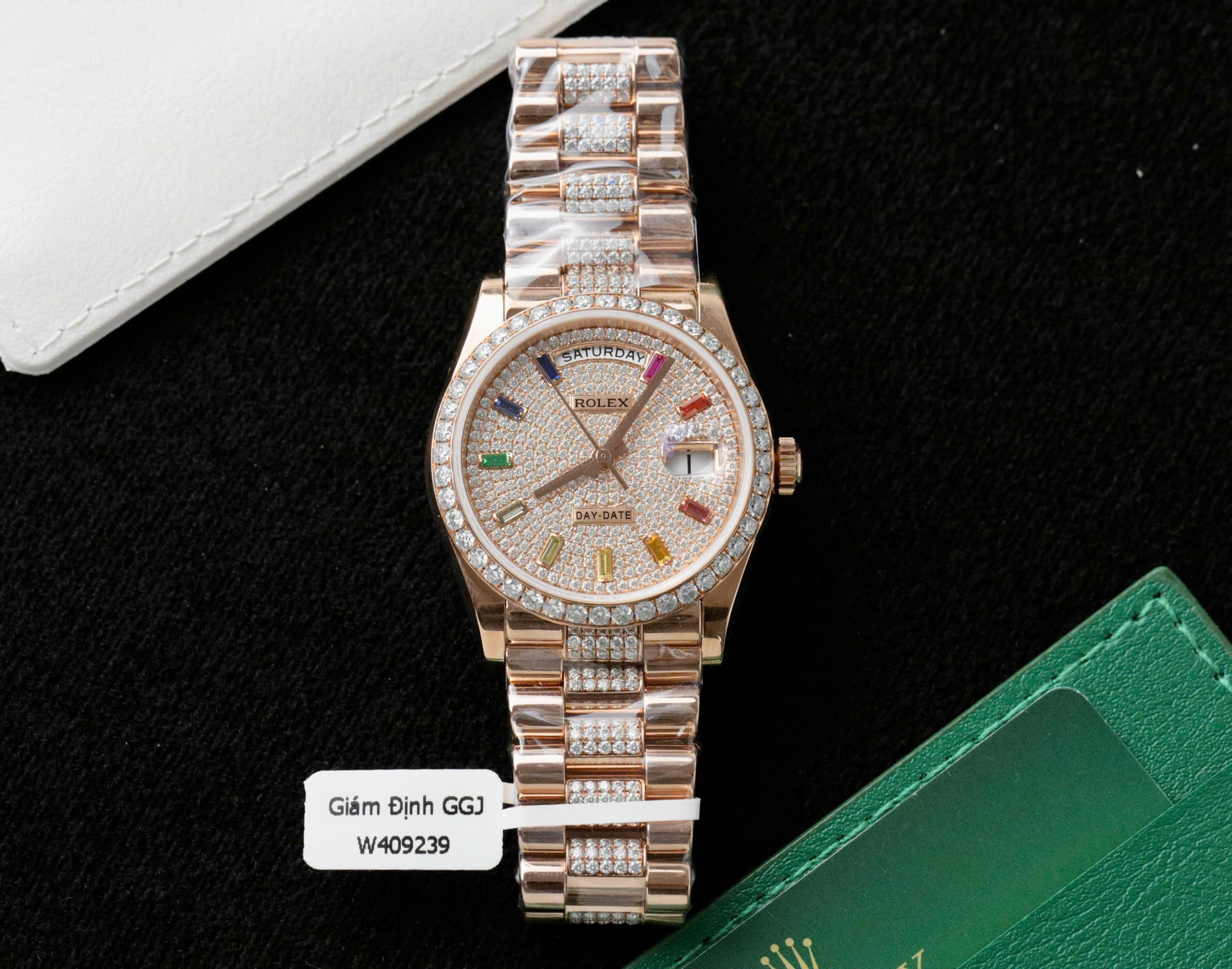 Đồng Hồ Rolex Day-Date 128345 Bọc Vàng 18K Đính Kim Cương Moissanite Chế Tác Hong Kong 36mm