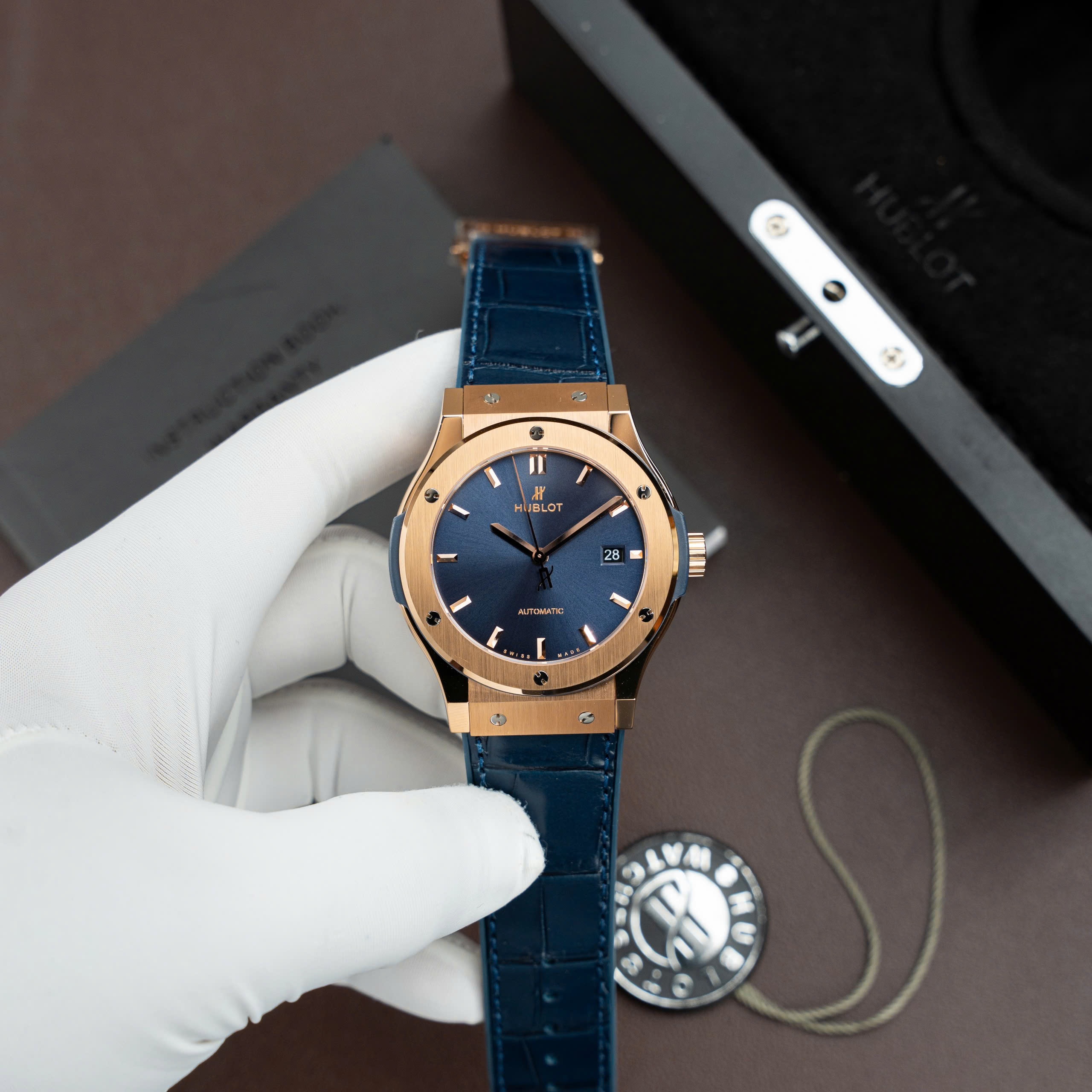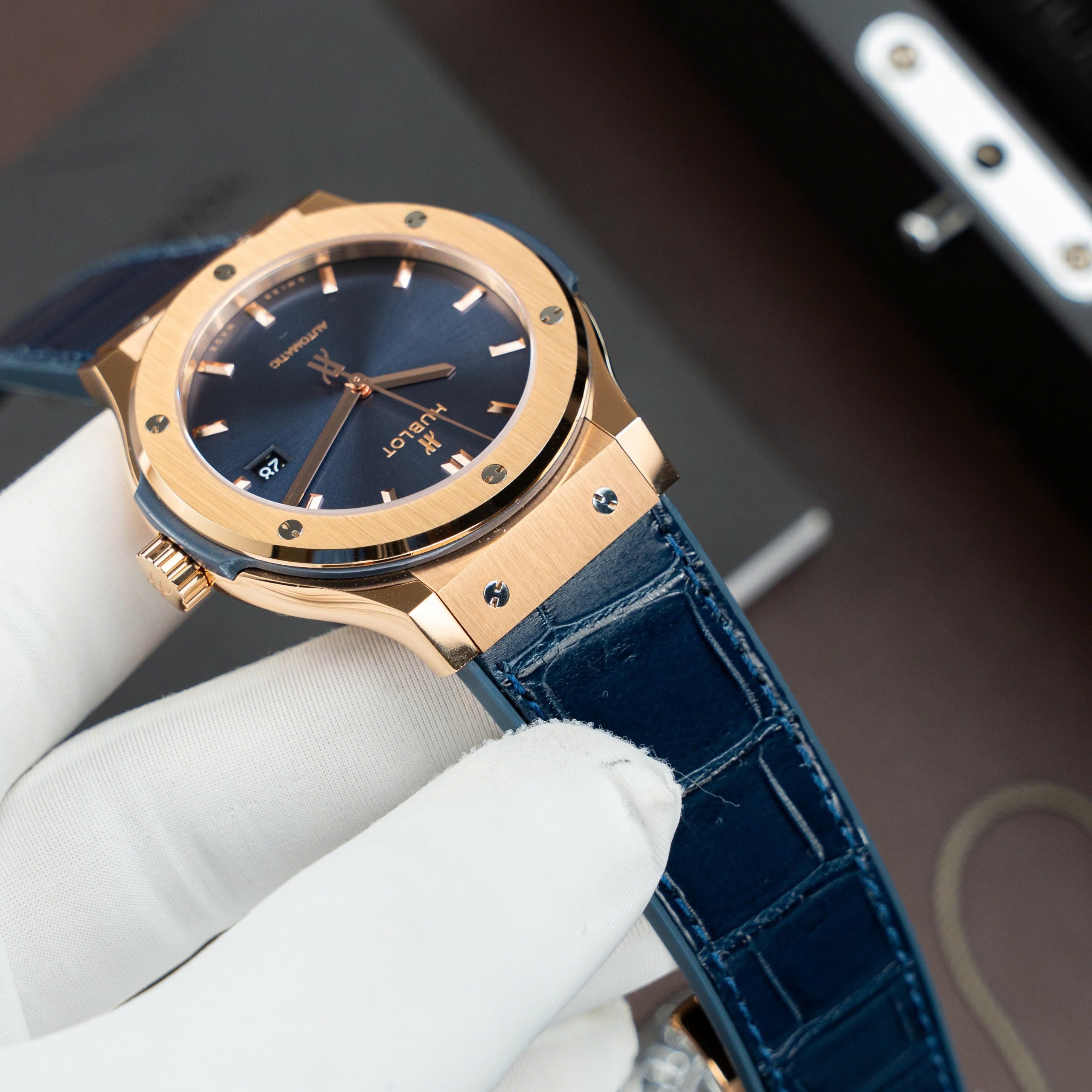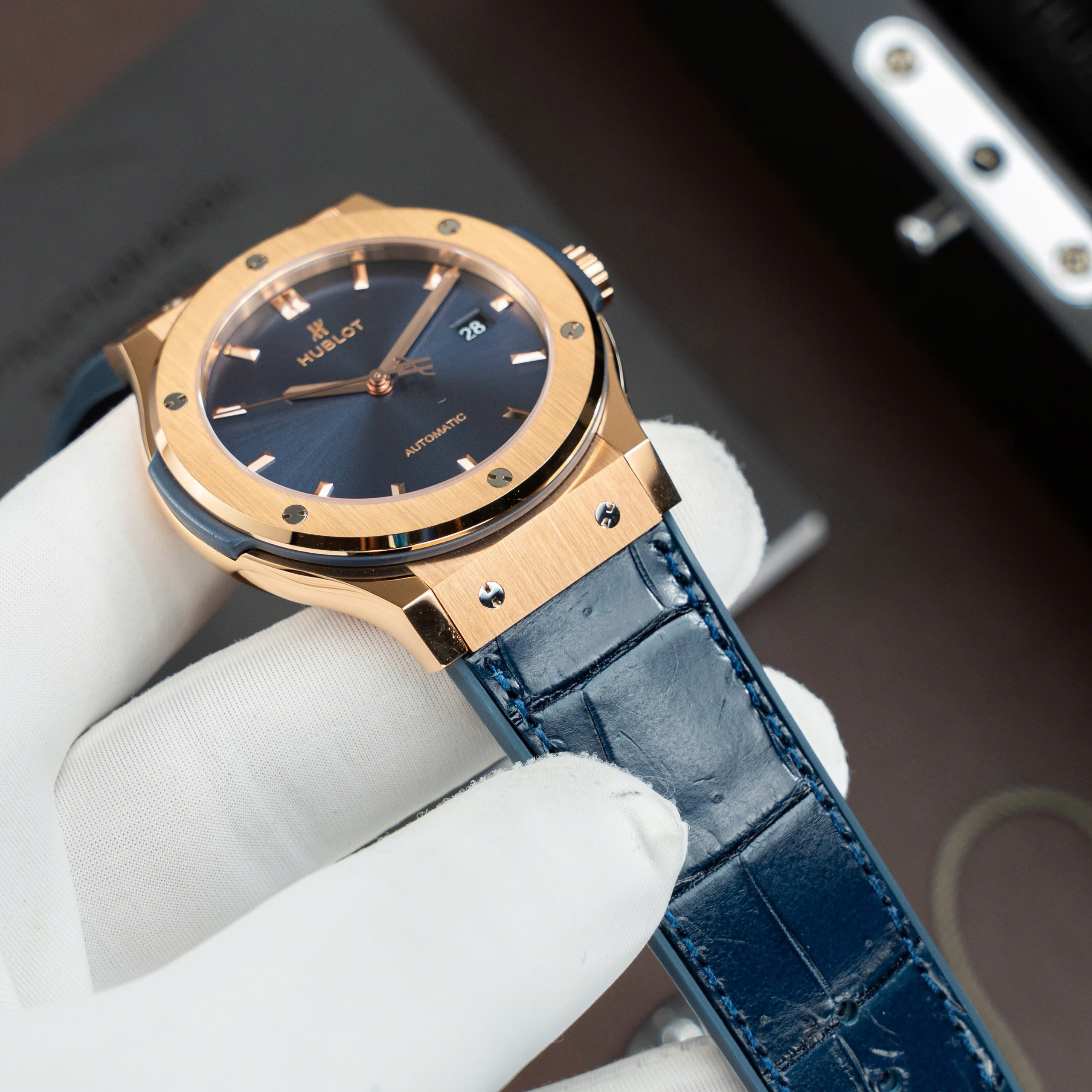 Hublot Classic Fusion Titanium King Gold SW300 Movement Blue Dial Crocodile Leather Strap 85 Grams 42mm
