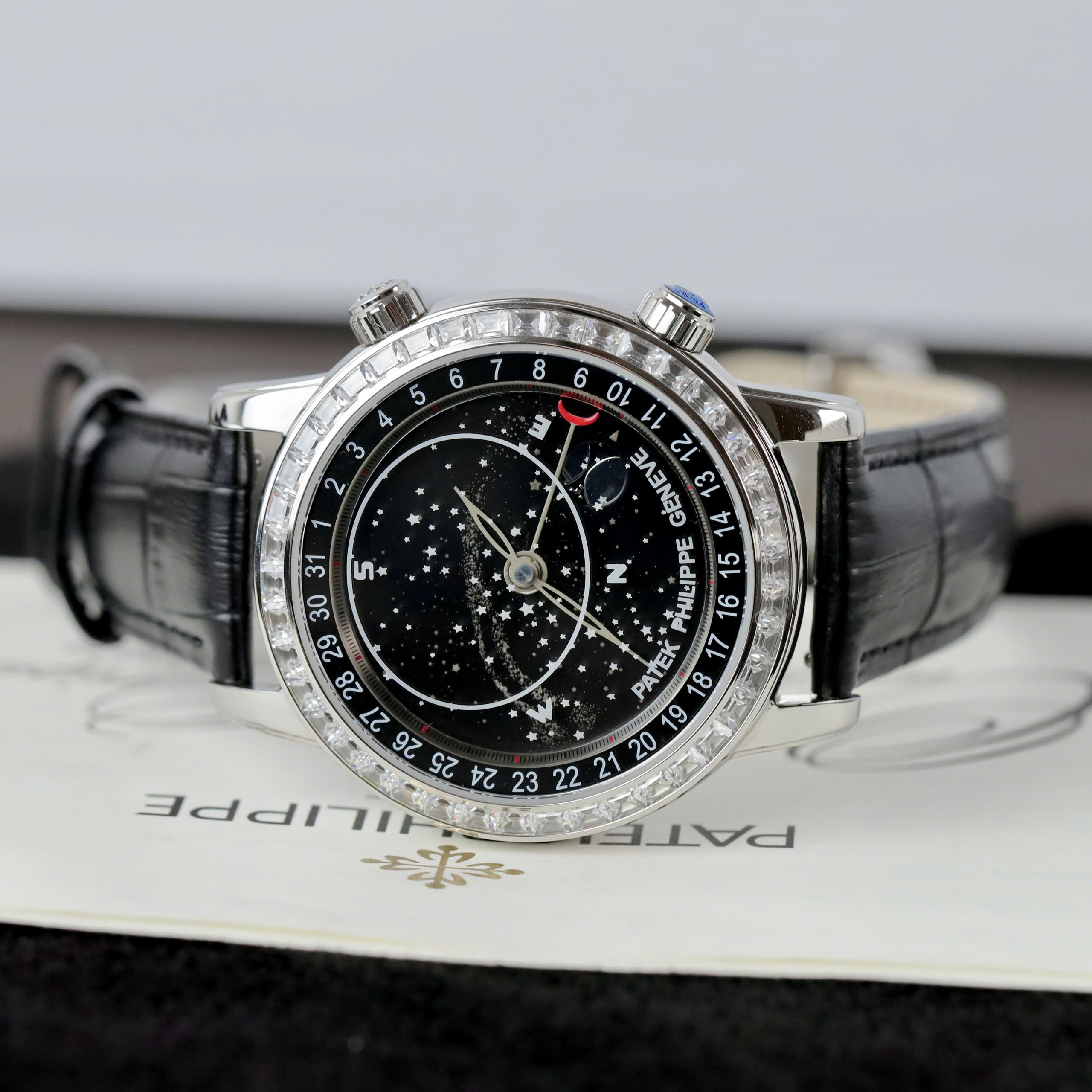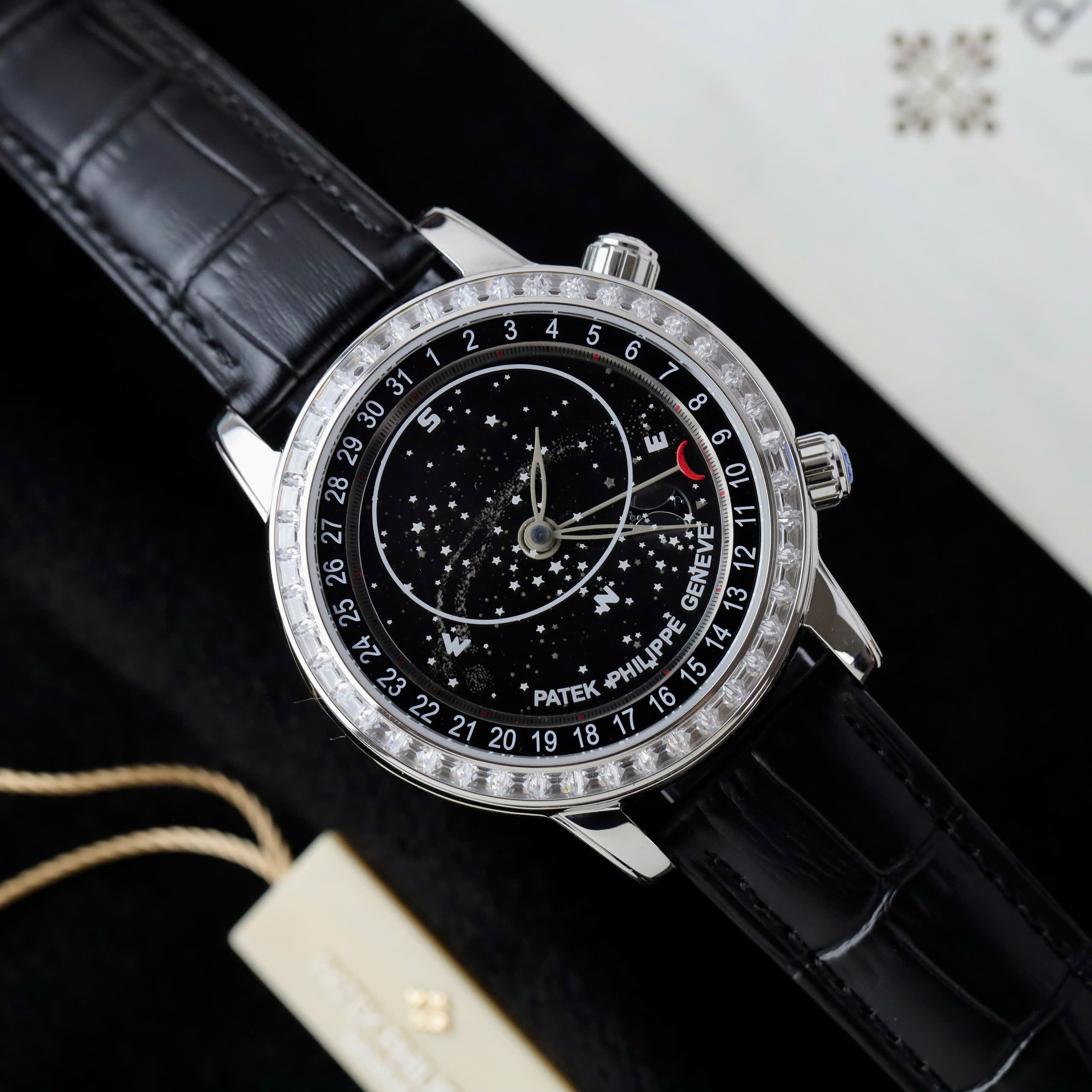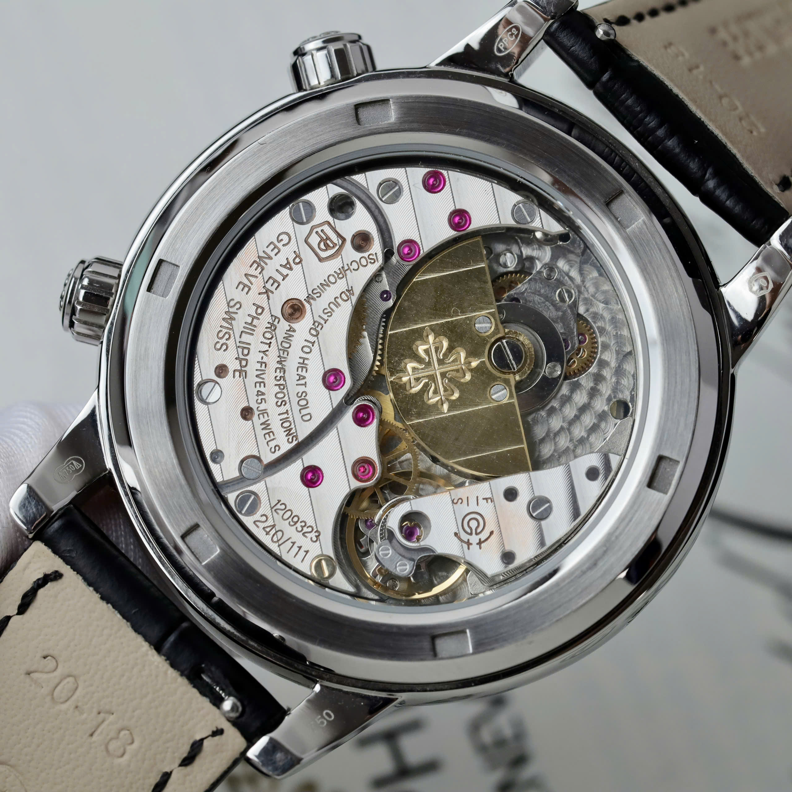 Patek Philippe Complications 6104G Bezel Diamonds Black Leather Strap Men’s Watch 44mm