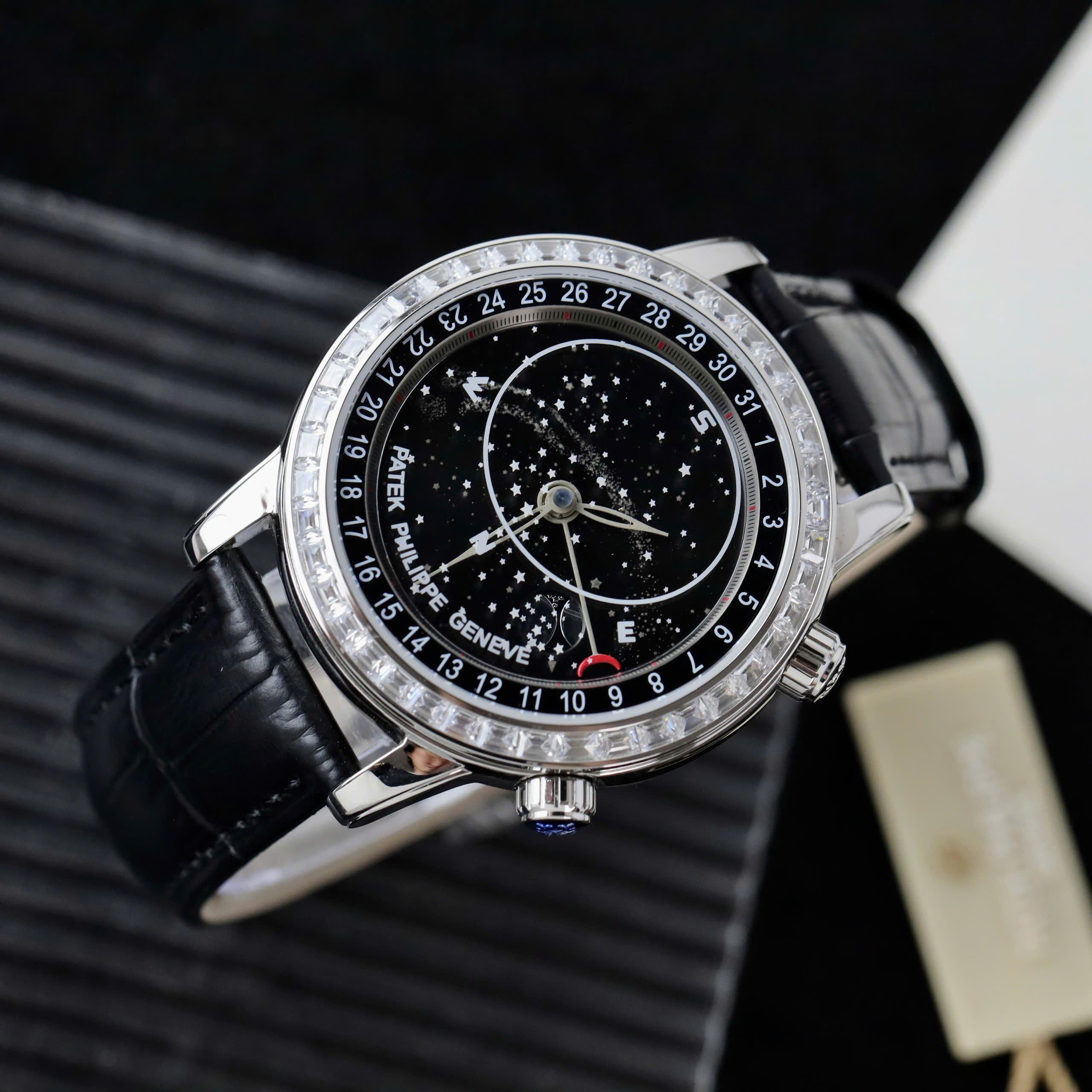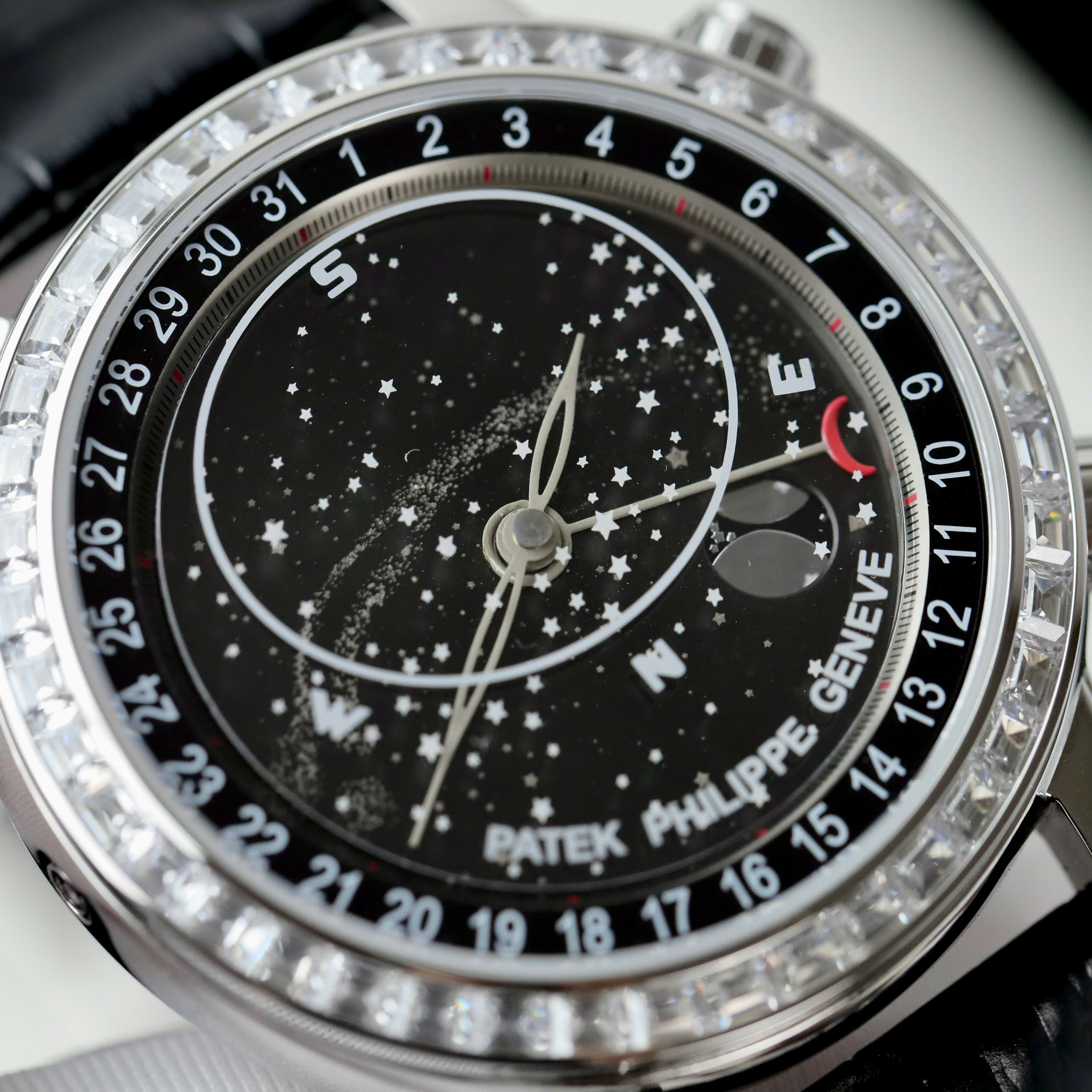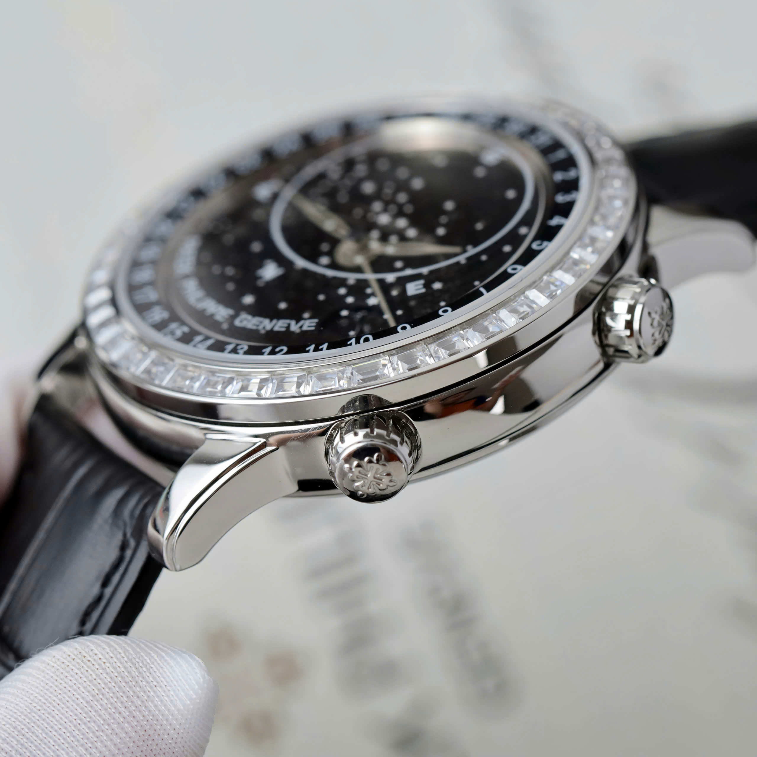 Patek Philippe Complications 6104G Bezel Diamonds Black Leather Strap Men’s Watch 44mm