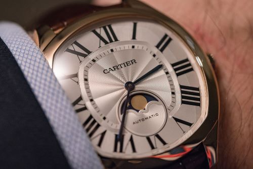 The Drive de Cartier Moonphase version further enhances its appeal with a romantic moon phase complication, positioned at 6 o’clock. This watch is the perfect choice for successful businessmen seeking a distinctive design that still retains Cartier’s characteristic luxury and prestige.
